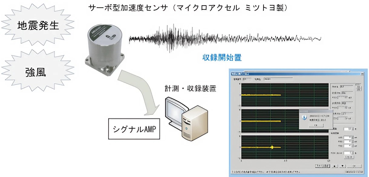 いろいろな計測センサーの入力が可能です。(加速度計・風向風速計など) 汎用のパソコンを使用した収録システムであるので操作性コストパフーマンスに優れています。 接続したセンサーの波形をリアルタイムで表示し収録します。 データ収録だけでなく、加速度3成分観測ポイントの震度計算を行います。 ネットワーク接続により遠隔地のパソコンからデータの閲覧・転送も可能です。 デスクトップPCを使用したシステムです。 加速度計は安価なMicro Accel V407を使用。 収録、振動の把握及び、高層階などの現在の揺れの確認ができます。